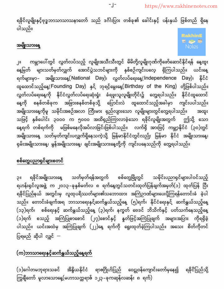 ၂။ ကမ္ဘာပေါ်တွင် လွတ်လပ်သည့် လူမျိုးအသီးသီးတွင် မိမိတို့လူမျိုးဂုဏ်ကို ဖော်ဆောင်နိုင်ရန် နေ့ထူးနေ့ မြတ်များ သတ်မှတ်လျှက် အောင်ပွဲသဘင်များကို နှစ်စဉ် ကျင်းပလေ့ရှိကြပါသည်။ ယင်းနေ့ရက်များမှာ - အမျိုးသားနေ့ ( National Day ) ၊ လွတ်လပ်ရေးနေ့ ( Independence Day ) ၊ နိုင်ငံထူထောင်သည့်နေ့ ( Founding Day ) နှင့် ဘုရင့်မွေးနေ့ ( Birthday of the King ) တို့ဖြစ်ပါသည်။ လွတ်လပ်ရေးနေ့ကို နိုင်ငံလွတ်လပ်ရေး ဆုံးရှုံးခံရဖူးသူ လူမျိုးတိုင်း၌ တွေ့ရပါသည်။ နိုင်ငံထူထောင်နေ့ကို စနစ်တစ်ခုက အခြားစနစ်တစ်ခုသို့ ပြောင်းလဲထူထောင်သည့်အခါမှာ ကျင်းပပါသည်။ အမျိုးသားနေ့ကိုမူ သမိုင်းအစဉ်အလာ ကြီးမားရှည်လျားသော လူမျိုးများတွင် တွေ့ရပါသည်။ အထူးသဖြင့် နှစ်ပေါင်း ၃၀၀၀ က ၅၀၀၀ အထိ ရှည်ကြာလာခဲ့ သော ရခိုင်လူမျိုးအတွက် ဤသို့သော နေ့ရက်တစ်ရက်ကို မဖြစ်မနေ လိုအပ်လာခြင်းဖြစ်ပါသည်။ လက်ရှိအားဖြင့် ကမ္ဘာ့နိုင်ငံ ( ၃ဝ ) တွင် အမျိုးသားနေ့ သတ်မှတ်ကျင်းပလျှက်ရှိနေသကဲ့သို့ မြန်မာနိုင်ငံတွင်လည်း မြန်မာနိုင်ငံအမျိုးသားနေ့ ၊ ရှမ်းအမျိုးသားနေ့ ၊ မွန်အမျိုးသားနေ့ ၊ ချင်းအမျိုးသားနေ့ တို့ကို ကျင်းပ နေသည်ကို တွေ့ရပါသည် ။
